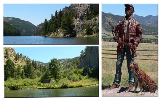 Helena National Forest: The forest surrounds Helena and has close to one million acres. We visited Gates of the Mountain Wilderness area, which is North of Helena on I-15, and was first discovered by Lewis and Clark. We took a guided sight seeing boat tour on the Missouri River that was very interesting. One of the stops was the Mann Gulch Fire Area. In 1949 a forest fire started and a ranger fought it by himself until the smoke jumpers arrived. They dropped 15 men and 13 died, including the ranger. The fire was the first major catastrophe to befall the US Forest Services Smoke Jumper program. The fire had a great impact on fire fighting training and safety. The movie "Red Sky's of Montana" was based on the fire. The lower left picture is Mann Gulch. The statue is in a field close to the area, and represents the Montana Rancher.